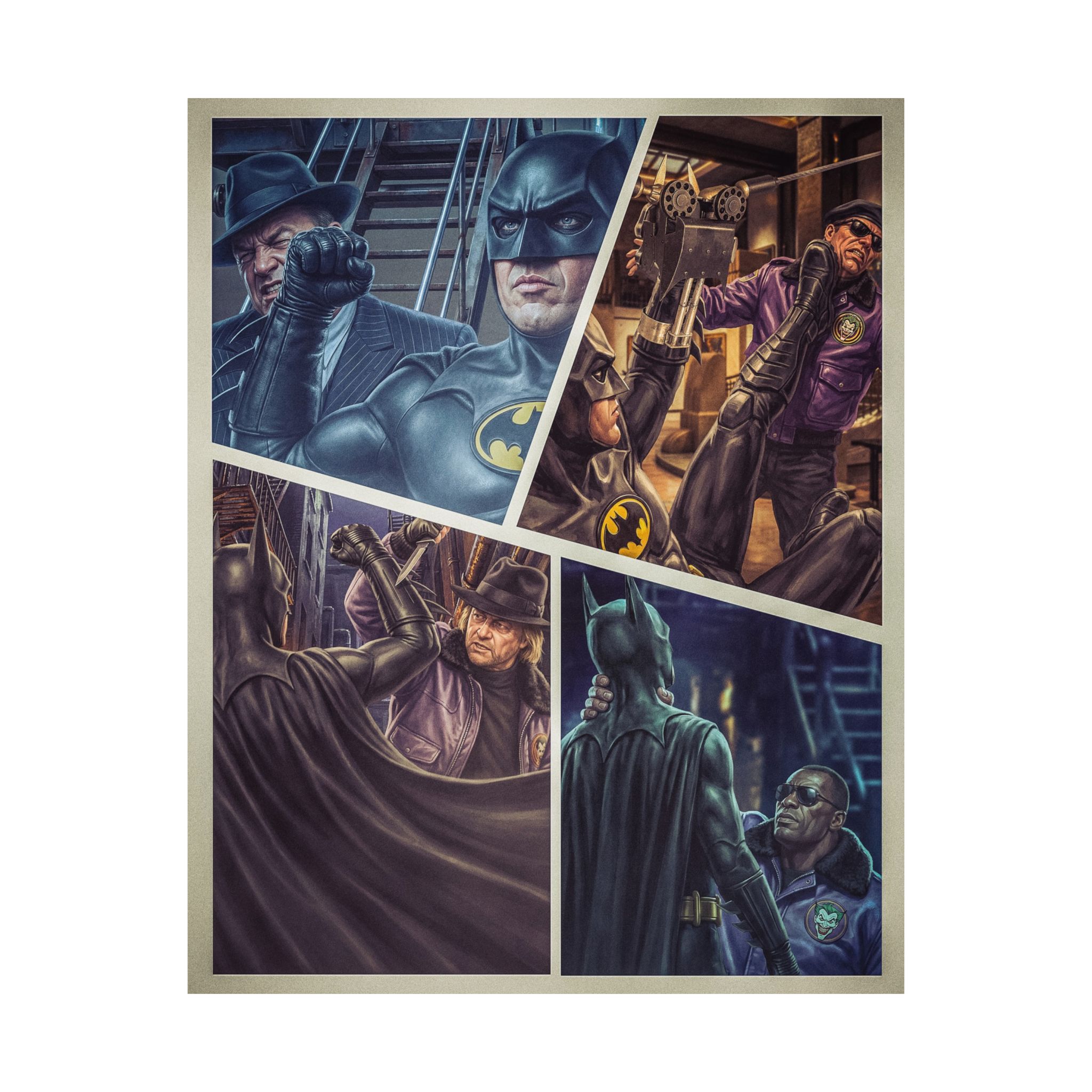 Each print preserves the dramatic contrast, texture, and shadow work that give it the feel of a lost comic cover from the golden era of dark superhero cinema.