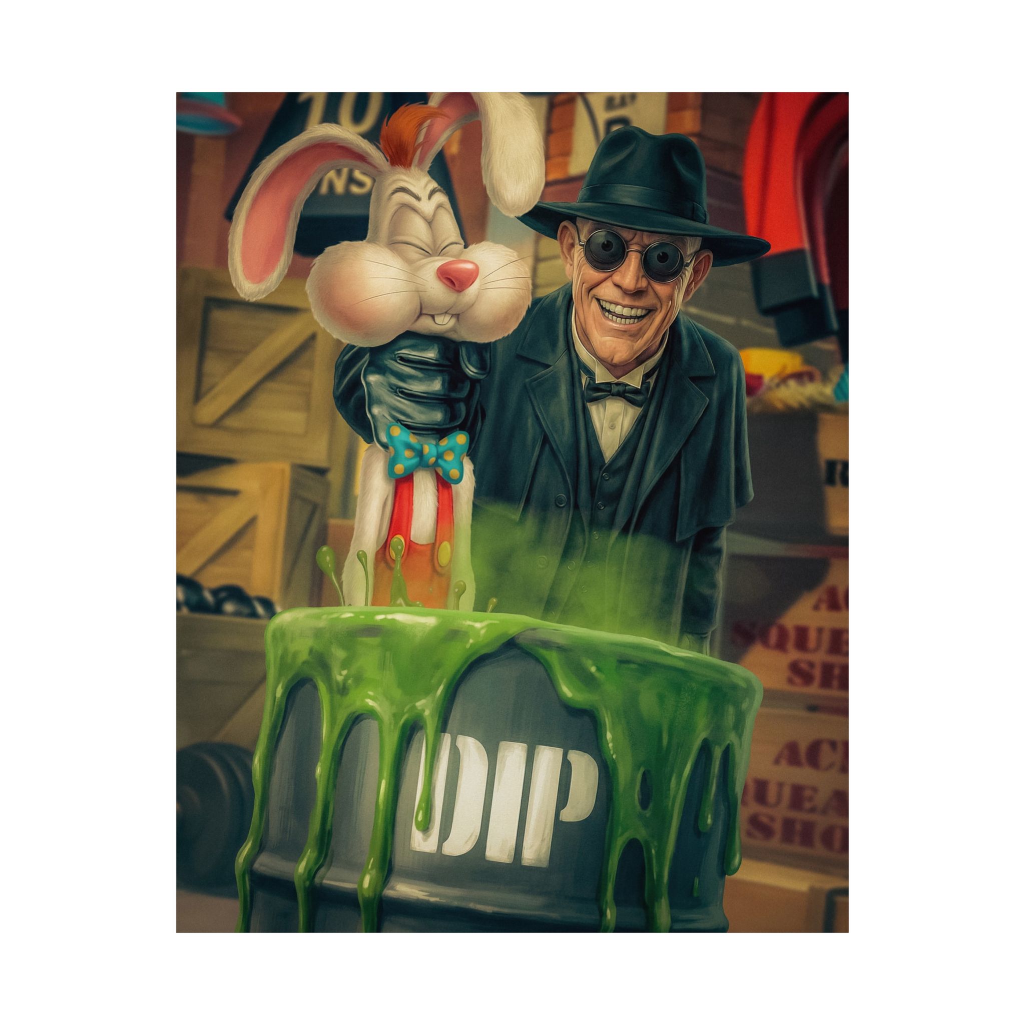 Set in a shadowy lab filled with glowing chemicals, rubber-hose limbs, and mischievous expressions, this print captures that perfect mix of slapstick and suspense that made cult animation unforgettable.