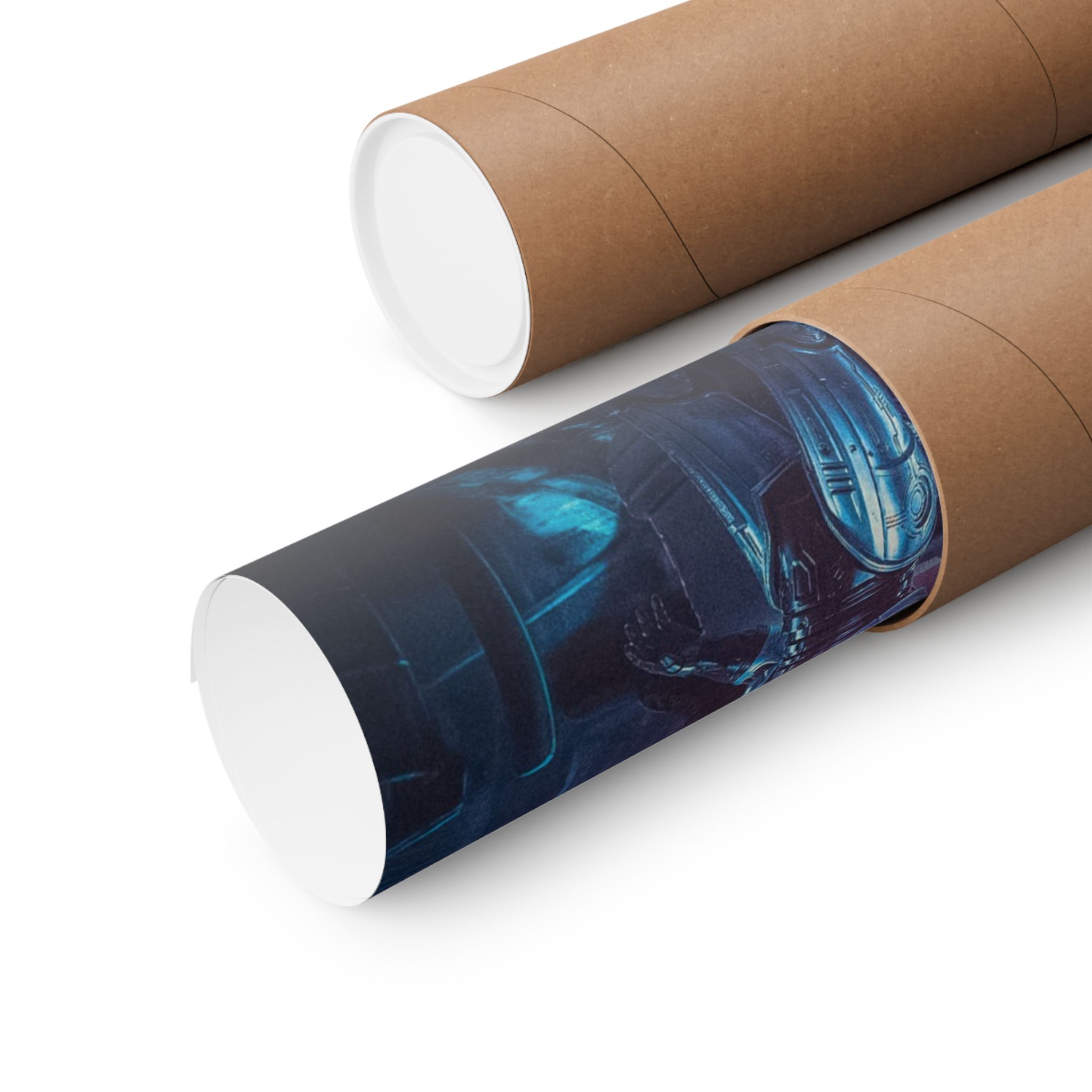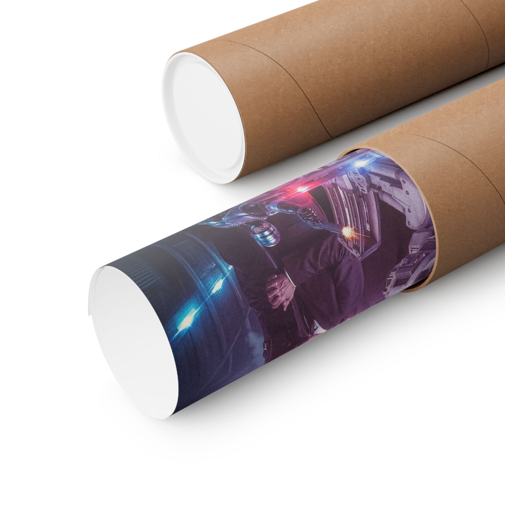 Metallic reflections, neon-lit dystopian streets, and that unmistakable visor glare give this print pure VHS-era power.