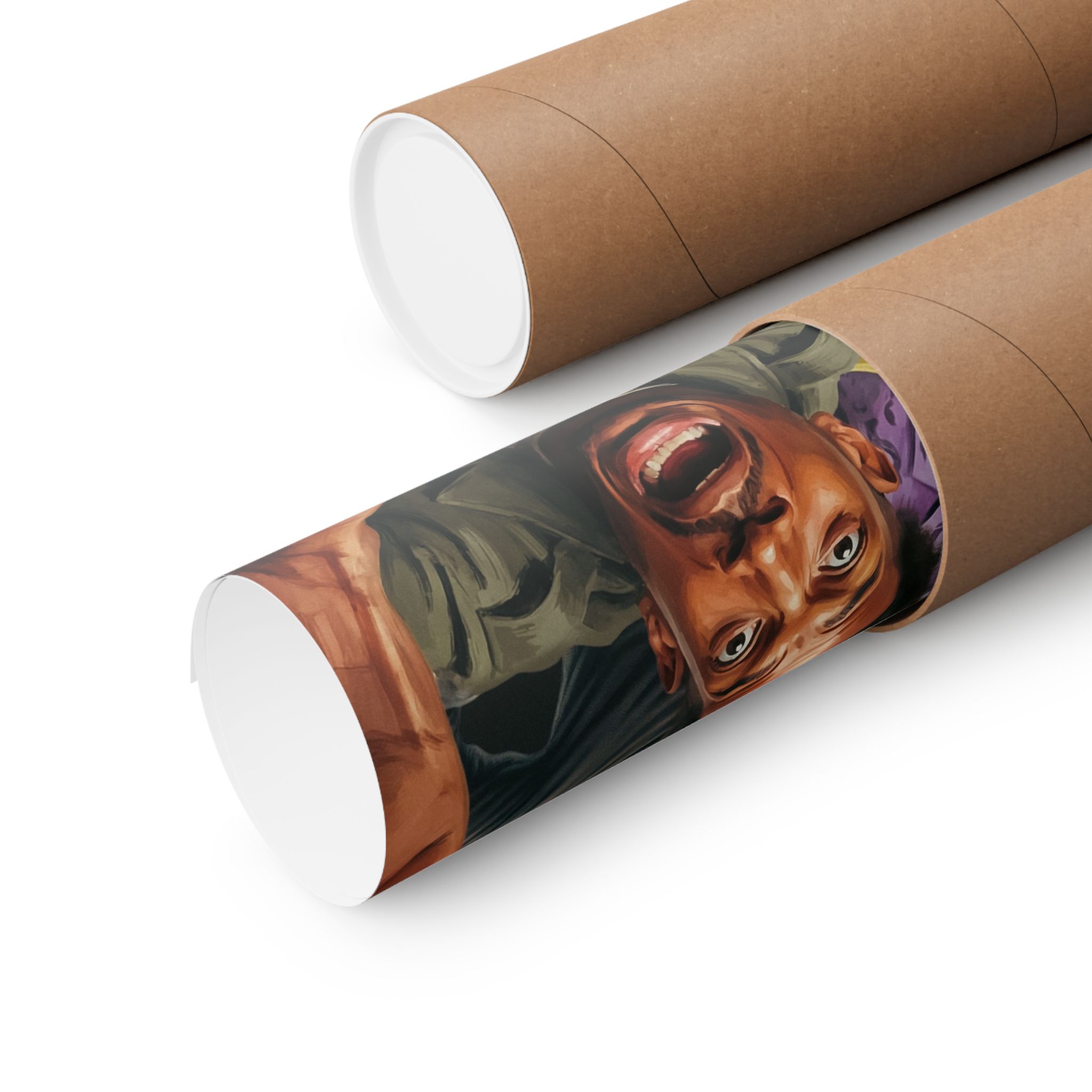 This bold, high-impact tribute print throws you straight back into the golden era of outrageous horror-comedy. Wide-eyed panic. Over-the-top chaos. A masked figure lurking just behind the madness.