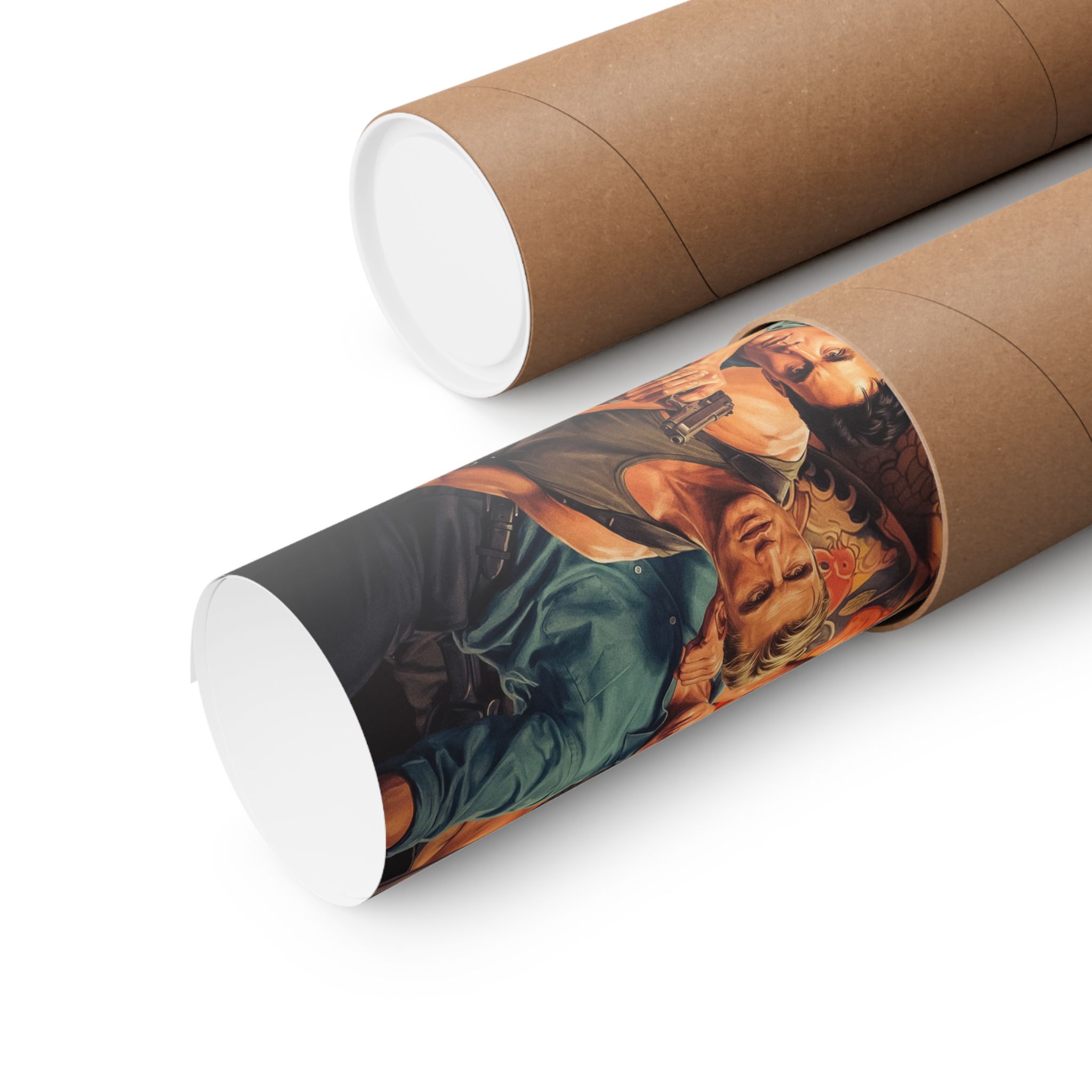 This dynamic art print channels classic buddy-cop intensity with dramatic city backdrops, glowing neon signage, and explosive standoffs. Every detail nods to that golden era of action films that lived in your local video store and your rewound VHS collection.