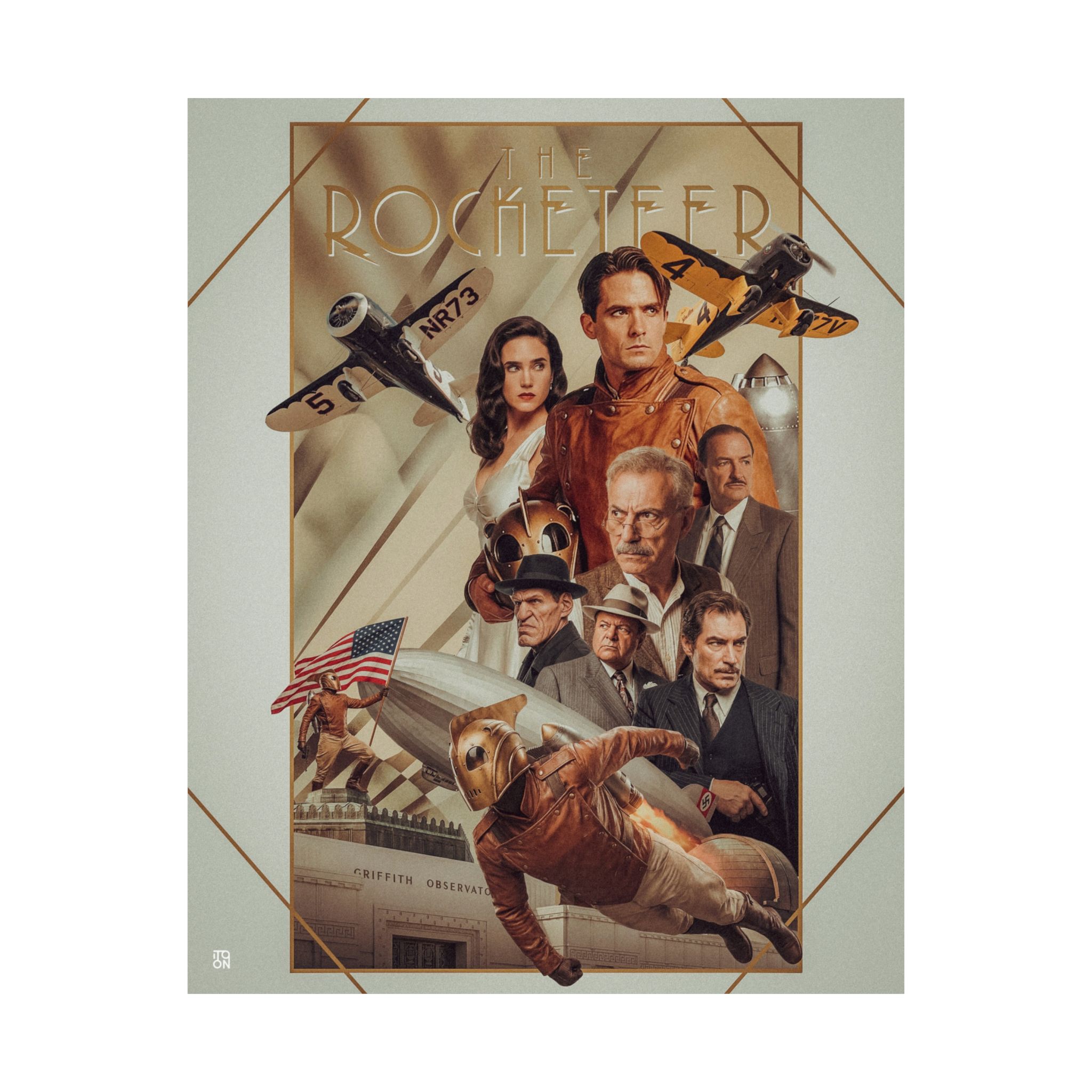 This stunning retro tribute print celebrates the golden era of pulp adventure and sky-soaring heroism. Inspired by the timeless charm of 1930s aviation aesthetics and classic comic book cinema, this piece captures the jet-pack hero in full vintage glory — Art Deco lines, dramatic sunset skies, and pure old-Hollywood energy.